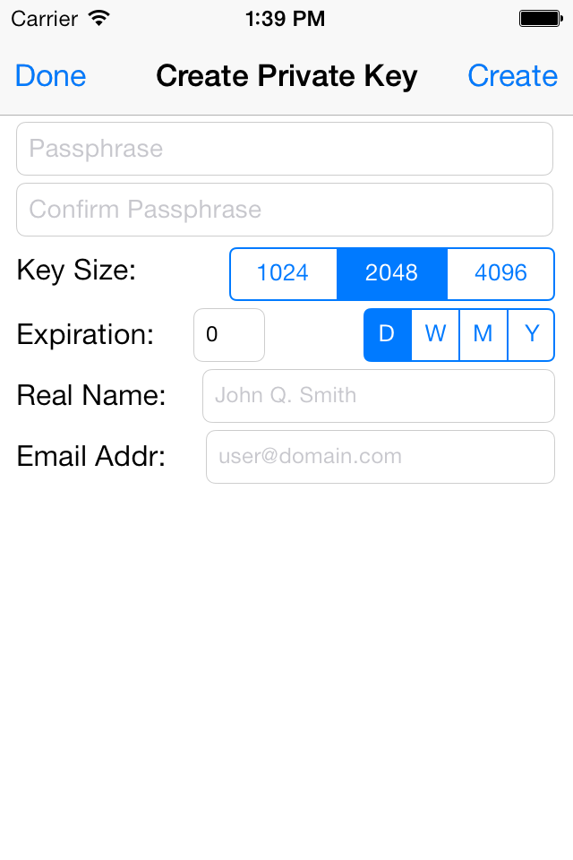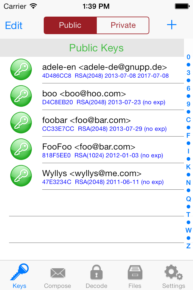 Generate RSA, ECDSA, and EdDSA encryption keys directly on your device. Import existing PGP keys, export public keys to share with contacts, and manage multiple keypairs with TouchID/FaceID protection.