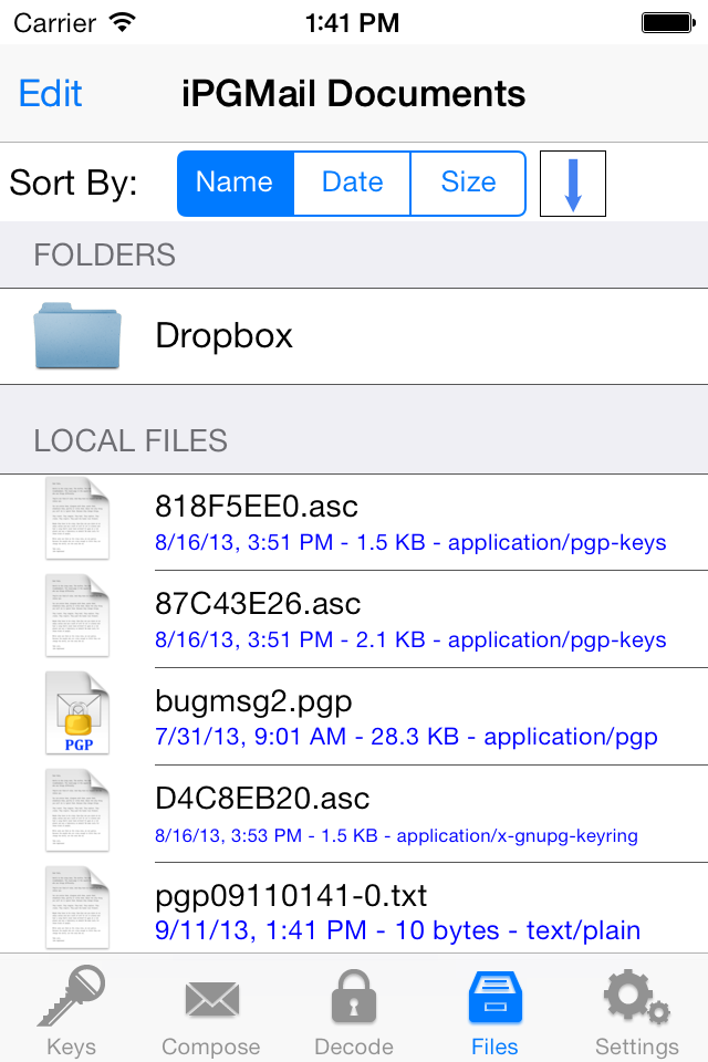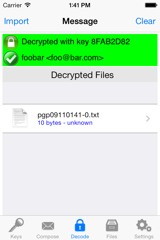Encrypt and decrypt files, not just emails. Supports .pgp, .gpg, and .asc file formats. Perfect for securing documents, photos, and sensitive files on your iPhone or iPad.